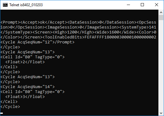 7. Acquire once on your In-Sight vision system. You should see data streaming to the second telnet program.