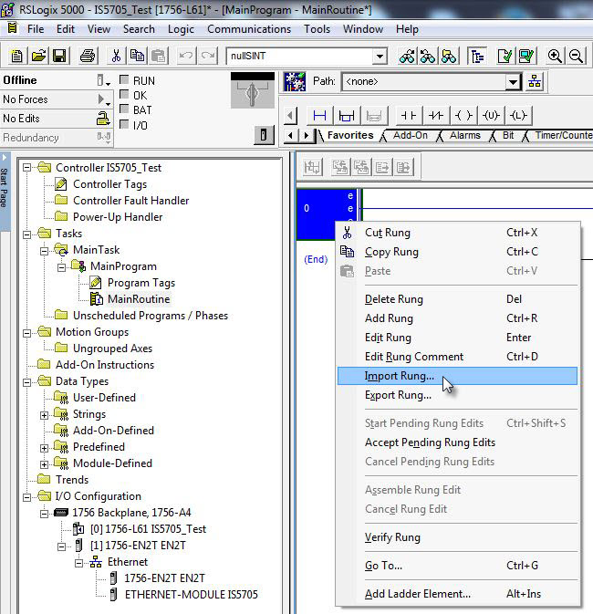 Within the main program, right-click on an empty rung and select the Import Rungs... option.