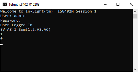 While logged on to the vision system through a telnet client, type the following command: EV A8 1 Sum(1,2,A3:A6)