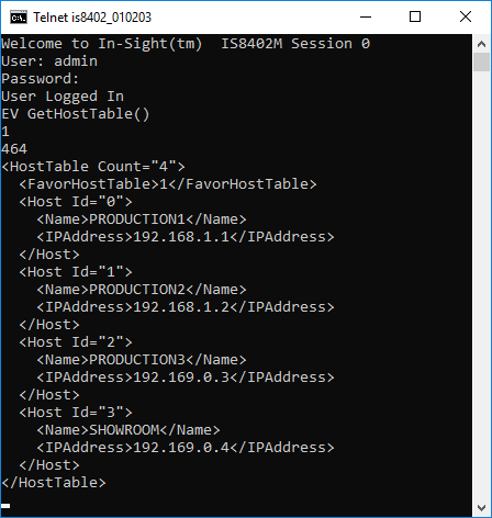 To retrieve the information contained in the In-Sight Host Table dialog, issue the following command: EV GetHostTable()
