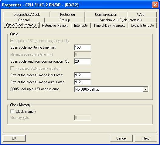 Tip: The Siemens Step 7 software will assign default I/O addresses to each of the modules added for the In-Sight vision system based on the definitions of each module in the In-Sight GSD file (see the above figure). It is allowed to change any or all of these I/O addresses. All of the modules that map out discrete bit data (acquisition control and status, inspection control and status, and soft event control) must be assigned addresses that are within the process-image input and output memory areas of the PLC. Most newer firmware on Siemens S7 series PLCs allow the sizes of this memory area to be changed (default size is 256 bytes, I0.0 - I255.7, Q0.0 - Q255.7). Other older firmware or models that are not configurable (consult Siemens PLC documentation) have a fixed size, usually 256 bytes. This can be seen in the picture above where each of the discrete bit data modules are mapped into I/O addresses starting at 0 and the byte/word modules are assigned addresses starting just above the process-image input and output memory areas of the PLC (256 and higher).A typical use case would be a configuration as shown in the figures below, which keeps each In-Sight vision system's I/O addresses in a more contiguous block than what the Step 7 software assigns. In order for the PLC logic to access the new I/O bit addresses, open the HW Config in the Step 7 software, open the properties of the PLC (CPU), go to the Cycle/Clock Memory tab of the dialog and the Size of the process-image input area and Size of the process-image output area. In the example, the sizes of the input and output areas should be changed to 912, so that the discrete bit data for the In-Sight vision system is accessible using the PLC's I and Q addresses for the vision system. If these process-image sizes are not changed, the bit values will not be read or written to correctly, although byte/word values will update correctly. Refer to the Siemens PLC documentation for the additional memory overhead required when these process image sizes are changed.