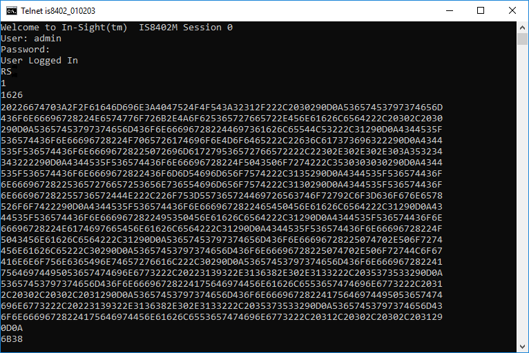 The In-Sight sensor initially responds with 1, indicating the command successfully executed. The following line (1626) represents the amount of data (in bytes) to be transmitted. Finally, the system settings data are sent, followed by a checksum (6B38) of the data.