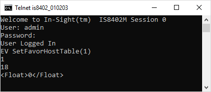 After issuing the SetFavorHostTable command, the In-Sight sensor responds with a status code (1), followed by the number of characters, in bytes (18). Finally, the results in XML format.