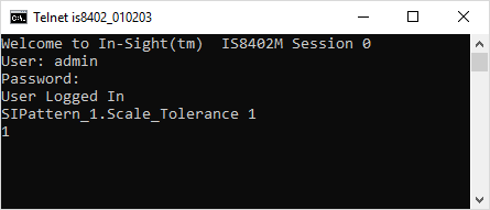 However, you would like to change that parameter's setting programmatically, to either enabled or disabled, based on a particular part. Issue the command SIPattern_1.Scale_Tolerance 1, as shown in the following telnet client window: