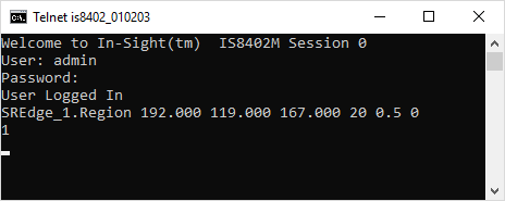 The In-Sight vision system responds with 1,indicating that the command was successfully executed.