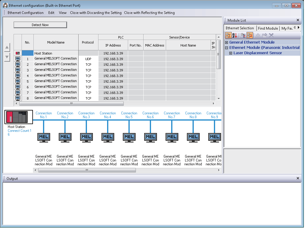 - Error information is displayed on the Output window when there is an error in the system configuration after executing the automatic detection of connected devices. Double-click the error on the Output window and correct the error at the error jump destination.