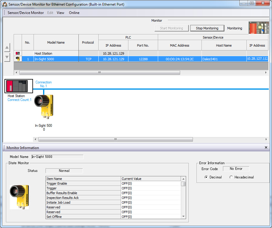 Click OK; the Status of vision systems connected to the Built-in Ethernet port LCPU will be displayed on the Sensor/Device Monitor window.
