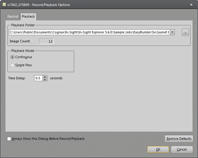 - After the first execution of the Record option, changes made in the Record Defaults panel are not reflected in the Record/Playback Options dialog unless you select Restore Defaults from the Record/Playback Options dialog for the active vision system or emulator.