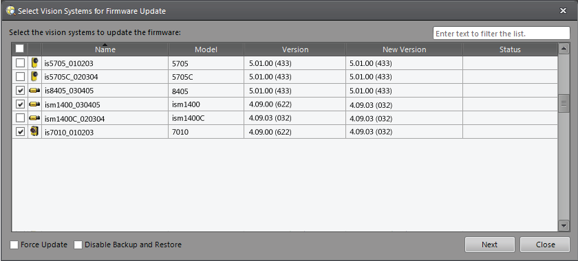 • Multiple vision systems can be updated at the same time even if the New Versions column shows different firmware versions.