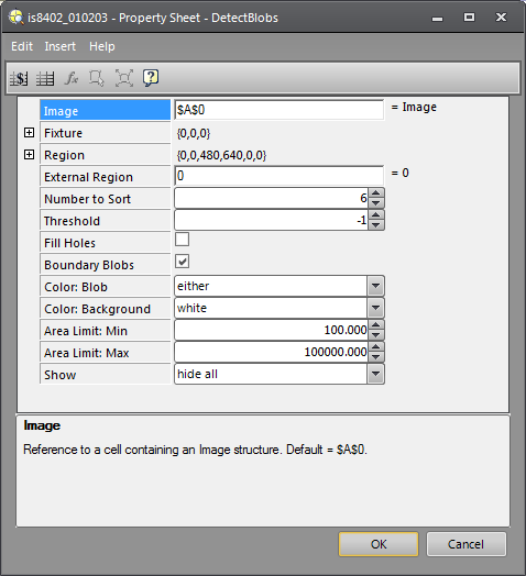 Syntax: DetectBlobs(Image,Fixture.Row,Fixture.Column,Fixture.Theta,Region.X,Region.Y,Region.High,Region.Wide,Region.Angle,Region.Curve,External Region,Number to Sort,Threshold,Fill Holes,Boundary Blobs,Color Blob,Color Background,Area Limit:Min,Area Limit:Max,Show)