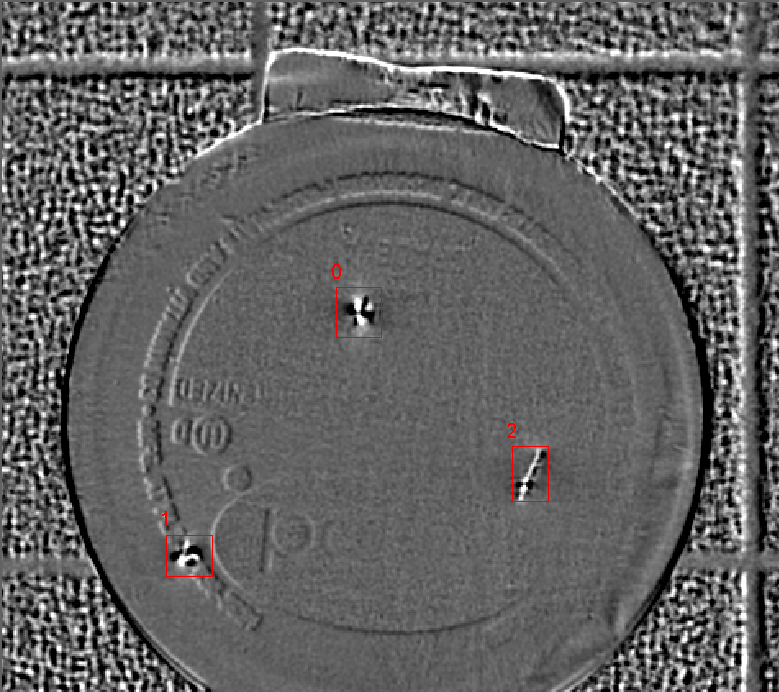 Finally, the SurfaceFlaw function uses the SurfaceFX output image as its input image, detecting areas of local intensity and size variations to identify flaws in the image (below).