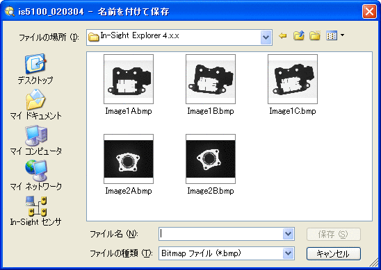 [画像に名前を付けて保存] ダイアログを使用すると、In-Sight ビジョンシステムのアクティブな画像を、後で取得するために保存することができます。画像は、ビットマップ (*.BMP) または JPEG (*.JPG) フォーマットで、任意の In-Sight ビジョンシステムまたはエミュレータに保存できます。