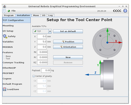 - If the TCP is NOT located directly on the Z axis, measure the distance between the TCP and the center of the tool flange (in millimeters) for the X, Y, and Z axes. Enter the measurements in the X, Y, and Z fields, respectively.
