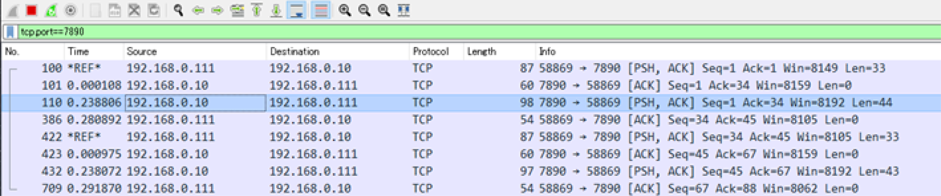 The first line of No. 100 is the transmission of the XT command, and the third line of No. 100 is the response. The processing time is about 239 ms. Line 4 of No. 386 is a TCP/IP ACK (Acknowledge) packet that you can ignore.