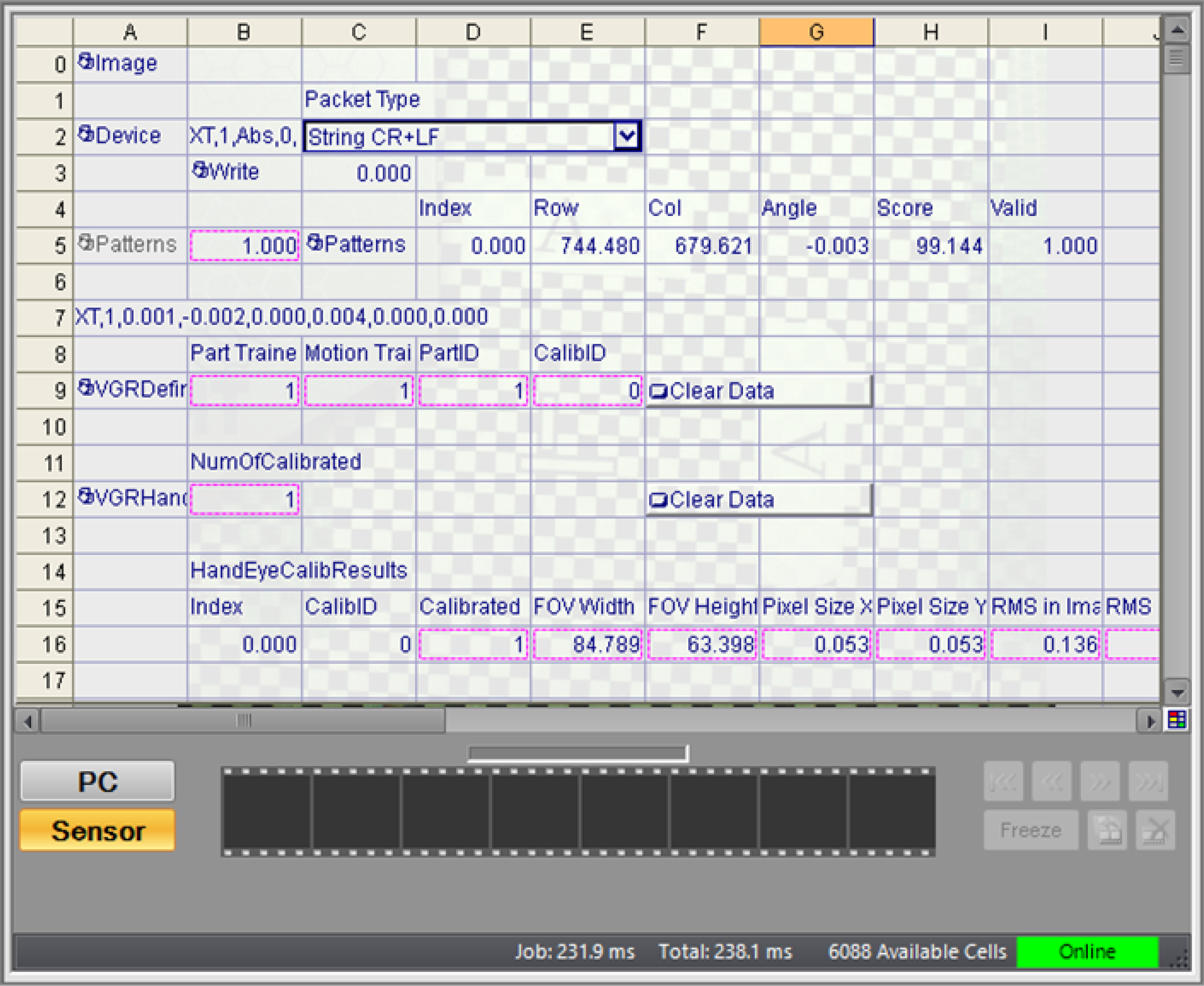 Alignment using VGR commands execute the spreadsheet several times after receiving the command. Therefore the execution time of the alignment process is different from the Job/Total processing time displayed in the status bar of In-Sight Explorer.