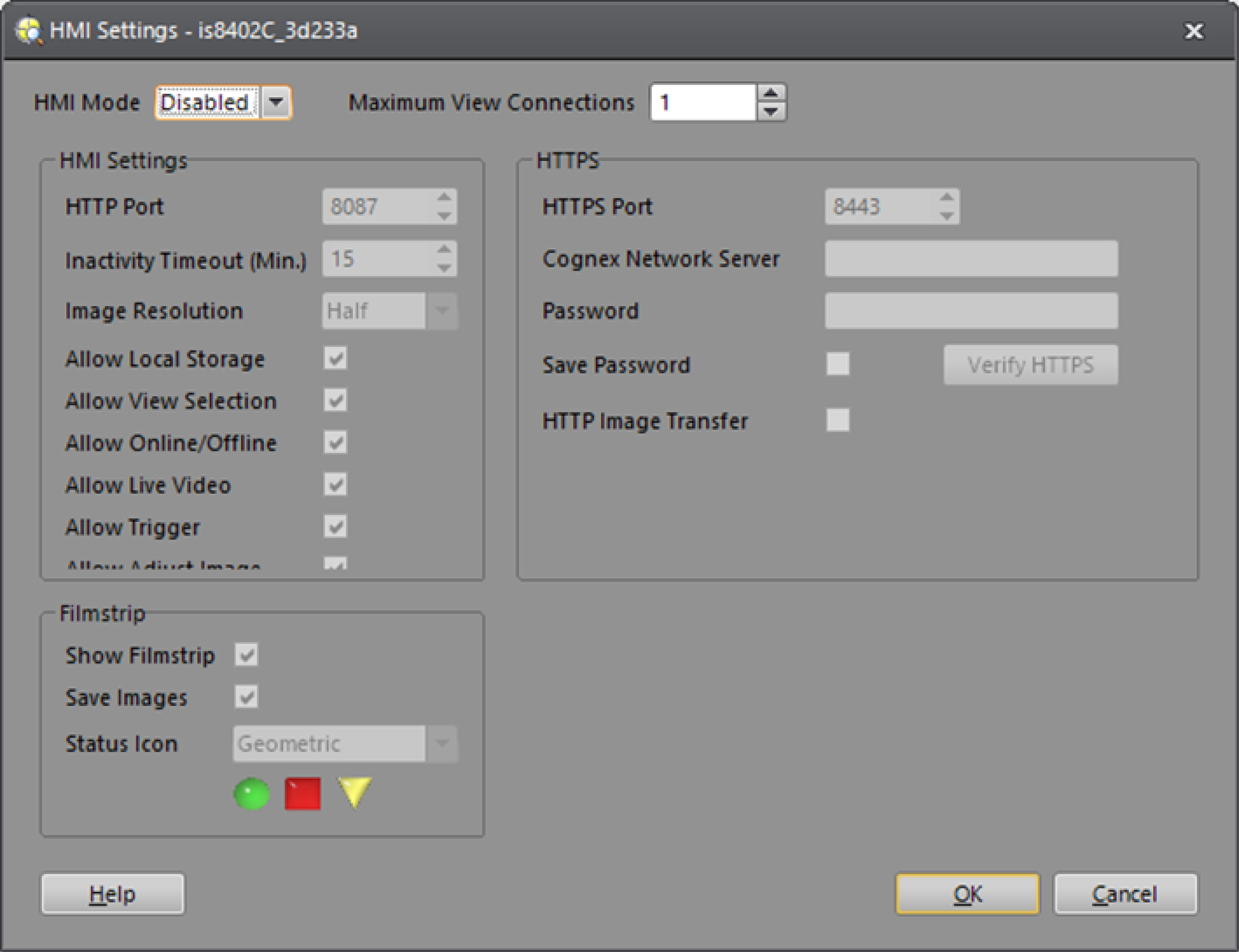 To stop the Web HMI, open the HMI Settings dialog from the Sensor menu. Select Disable in the HMI Mode dropdown, and set Maximum View Connections to 1.