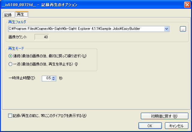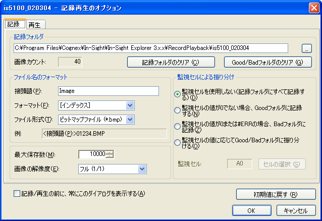 [記録/再生のオプション] ダイアログでは、個々のビジョンシステムやエミュレータの記録/再生の設定を行うことができます。このダイアログで設定を行った後、取り込んだ画像の記録と再生を行うことができます。画像は、PC 上の指定した記録フォルダに保存されます。