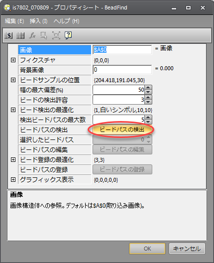 2. プロパティシート内で [BeadFind] パラメータをクリックします。Ctrl + Shift + A キーを押すか、絶対参照 ボタンをクリックして、BeadFind パラメータおよびセル参照を、以前に作成された BeadFind データに設定します。その後 [OK] をクリックします。