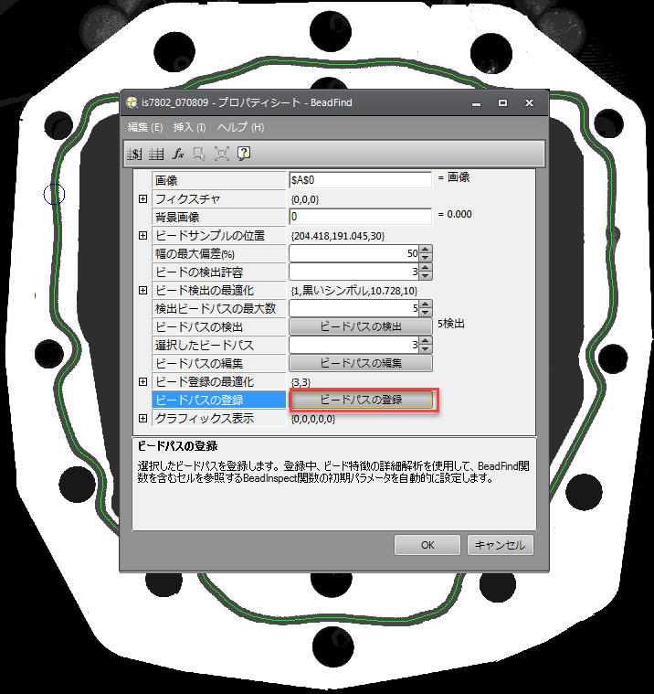 :  登録ビードは、定義上は良好なビードです。したがって、BeadInspect 関数の初期パラメータは、参照された BeadFind 関数の結果に基づいて自動的に設定され、登録ビードパスの検査時に確実に欠陥が検出されないようにします。