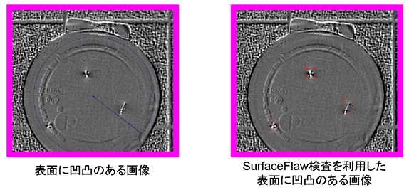 SurfaceFX 関数で特徴の強調を実行します。照明を使用して、オブジェクトの 3D 特徴を強調する高コントラストの画像を作成し、その他のビジョンツールによって特徴の抽出と検査を行います。この関数は、浮き彫り、浮き出し、スタンプ、エッチング、凹凸、そして欠陥 (欠け、くぼみ、しわ、穴、裂け目など) が生じている表面の特徴を分離することによって、ノイズまたはクラッタ (あるいはその両方) を表面の背景から取り除きます。コントラスト画像が生成されると、その他のビジョンツール (OCRMax、TrainPatMaxRedLine、FindPatMaxRedLine、DetectBlobs、SurfaceFlaw、および InspectEdge) を検査と欠陥検出に使用することができます。