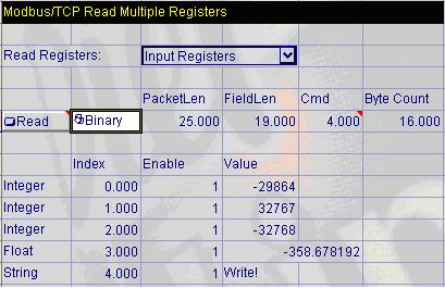 These values are in the floating-point format. In the ProfibusGateway.cxd file, the BGetInt function in cell D21 reads the binary value at Byte 15 (the lower byte of the word read).