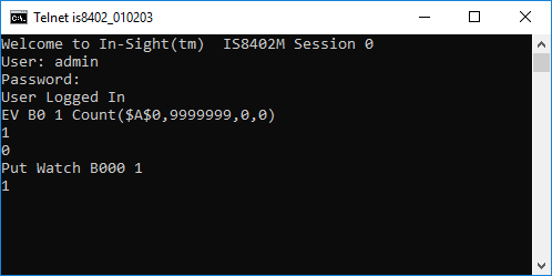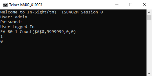 4. From the command prompt, start a second telnet session and log on to the In-Sight vision system. When logging on, specify the host name or IP address and port number 50000, which is the default DataChannel port. For example: telnet telnet is8402_010203 50000.