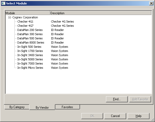 When the following dialog appears, select your model of In-Sight Vision System from the list. This option will appear once the Add-On Profile (AOP) is installed.