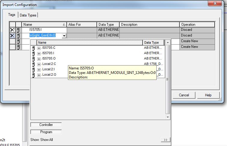 The list should contain names that match the name given in Step 4 (the name of the In-Sight vision system; in this example, the name given was IS5705, so the list contains IS5705:I and IS5705:O).