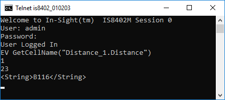 The In-Sight sensor returns 1 to indicate that the command was executed successfully. The number of characters (in bytes) is followed by the cell location.
