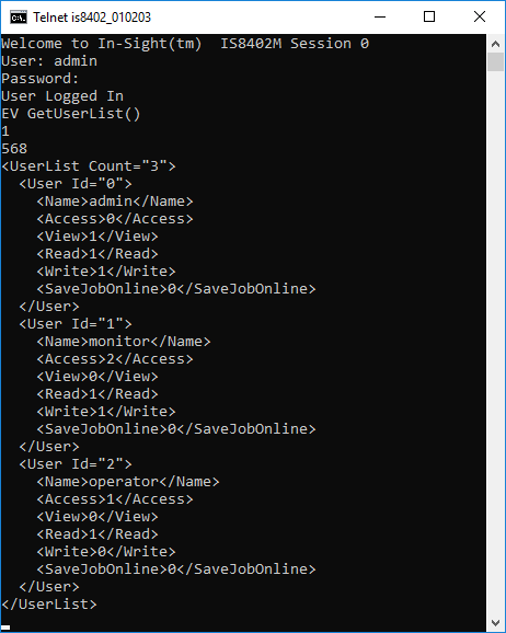 The In-Sight sensor responds with a status code (1), followed by the number of characters, in bytes (568). Finally, the information configured in the User List dialog is returned.