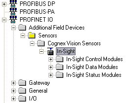 The In-Sight vision system should now be displayed as a device on the PROFINET IO system, along with the In-Sight vision system's various modules supported by the particular PROFINET IO implementation.