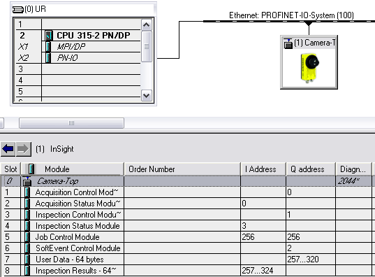 Tip: The Siemens Step 7 software will assign default I/O addresses to each of the modules added for the In-Sight vision system based on the definitions of each module in the In-Sight GSD file (see the above figure). It is allowed to change any or all of these I/O addresses. All of the modules that map out discrete bit data (acquisition control and status, inspection control and status, and soft event control) must be assigned addresses that are within the process-image input and output memory areas of the PLC. Most newer firmware on Siemens S7 series PLCs allow the sizes of this memory area to be changed (default size is 256 bytes, I0.0 - I255.7, Q0.0 - Q255.7). Other older firmware or models that are not configurable (consult Siemens PLC documentation) have a fixed size, usually 256 bytes. This can be seen in the picture above where each of the discrete bit data modules are mapped into I/O addresses starting at 0 and the byte/word modules are assigned addresses starting just above the process-image input and output memory areas of the PLC (256 and higher).
