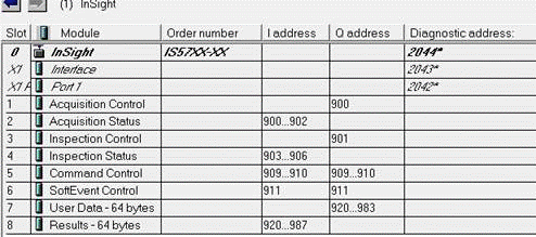 All of the available modules for the In-Sight vision system are automatically added to the hardware configuration. These modules allow access to the various subsystems in the In-Sight vision system. The default UserData and InspectionResults modules are 64 bytes in size. In order to change the sizes of the modules, delete them from the list and drag the appropriately sized module from under the In-Sight Data Modules folder in the Catalog tree to the Slot in the list.