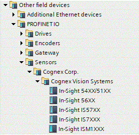 To add an In-Sight vision system to a PROFINET network, browse to the In-Sight node of the Hardware Catalog (PROFINET IO > Additional Field Devices > Sensors > Cognex Vision Sensors), and then drag an instance of the In-Sight vision system into the PROFINET IO System in the hardware configuration.