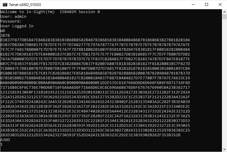 The In-Sight sensor responds with 1, indicating that the image data was successfully sent to the sensor.
