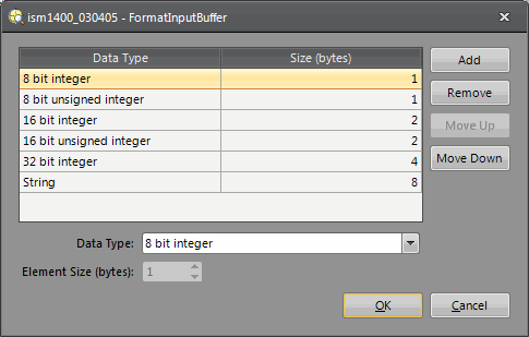 The FormatInputBuffer and FormatOutputBuffer dialogs are used to automatically configure data for the FormatInputBuffer and FormatOutputBuffer functions, and return a Buffer structure containing the formatted data. For more information, see FormatInputBuffer and FormatOutputBuffer.