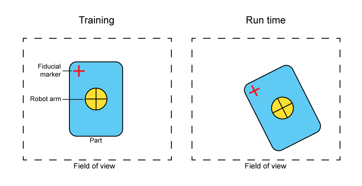 You can set up reference points called fiducial markers for robot arm positioning using standard In-Sight pattern finding tools, and train the robot arm controller to position the robot arm relative to those fiducial markers.
