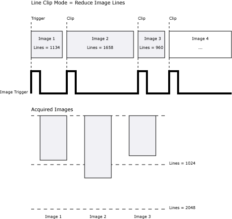 • Set the Trigger type to Camera to clip images properly. With any other Trigger type, if the trigger arrives while an image is being acquired, the current image is not clipped and the trigger is missed.