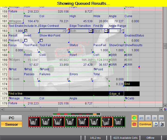 When finished monitoring the results, click the Online button in the toolbar again to place the vision system Offline. When the vision system is placed Offline, no new results are added to the filmstrip. When an existing pass or fail graphic is selected, the stored image and spreadsheet results are loaded to the display and the spreadsheet is read-only. Click the Continue button to return to the standard Offline mode of operation.