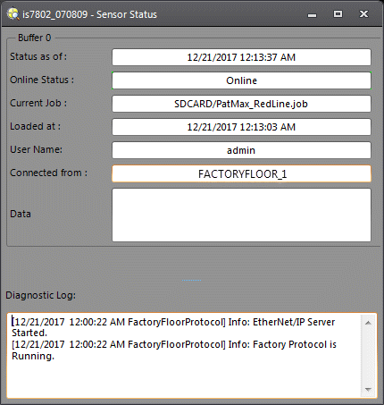 Eight memory buffers are allocated within the vision system's memory for the Machine Status Stack. The Sensor Status shows the contents of these memory buffers, along with a diagnostic log of information used to diagnose errors on the In-Sight vision system.