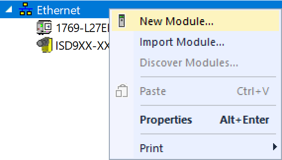 Add a connection to your Ethernet Communications Card. Under the I/O Configuration node, select the Ethernet Node under the Ethernet Module, right-click on the icon and select New Module from the menu.