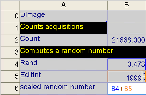 Insert these functions into the spreadsheet: Count, Rand, EditInt, and Sum. Set the Sum function's parameters as a cell reference to the sum of the value returned by Rand and EditInt functions.