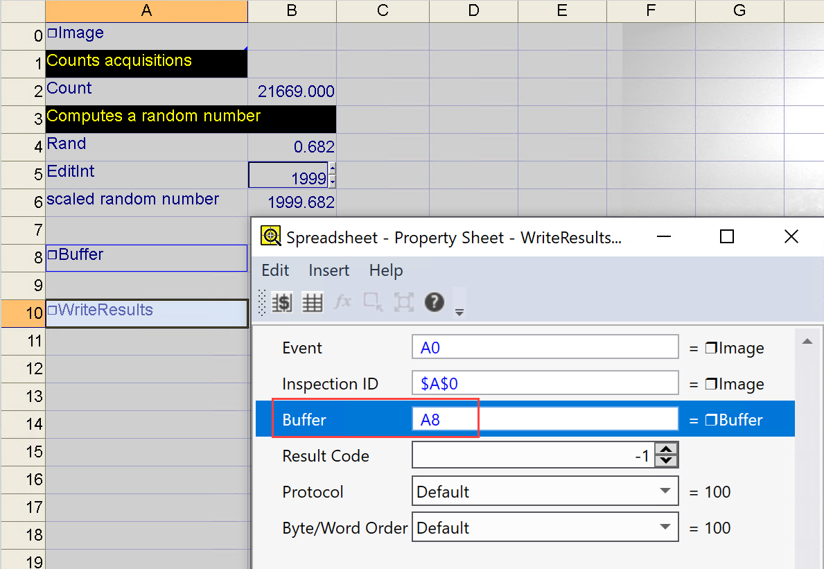 This function takes a buffer of data created by the FormatOutputBuffer function and writes it to the data area in the In-Sight vision system's EtherNet/IP Input Assembly when the event configured in the WriteResultsBuffer executes. This data is then transferred to the PLC during the next RPI cycle after the execution of the spreadsheet completes.