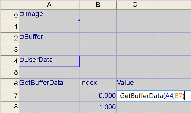 Right-click an empty cell and insert the GetBufferData function into the spreadsheet. Set the GetBufferData function's ReadBuffer parameter as a cell reference to the recently created ReadUserDataBuffer function. The GetBufferData function's index parameter determines which data value in the FormatInputBuffer to reference. For example, if you set the index parameter to 0, the first floating-point data value in the FormatInputBuffer will be returned. If you set the index parameter to 1, the second floating-point data value in the FormatInputBuffer will be returned.