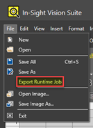 After you have trained and tested your ViDi tools and are ready to place them in their application environment, from the File menu, select Export Runtime Job.