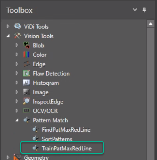 Select TrainPatMaxRedLine function from Vision Tools in the Toolbox, on the right side of the screen.