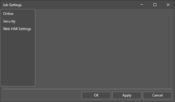 The Job Settings dialog is used to setup settings for the In-Sight vision system while online, to configure security for accessing a job, and configure WebPage authentication and timeout settings.