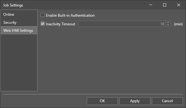 While the job is online, the Inactivity Timeout determines the interval for user interaction with the PC running the WebPage HMI. When this setting is enabled (it is enabled by default), the current user will be logged off and all WebPage Elements that require authorization (see the WebPage Element Authorization for more information) will become disabled if there has not been any interaction during the specified time period.