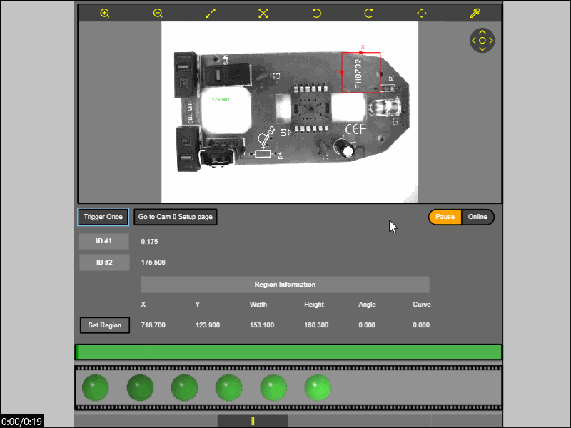 By default, when the job is set Online, the HMI Filmstrip is in a Live state, indicating with a set of Passed/Failed marker graphics if the recorded acquisition has passed or failed, as shown below (you can change the default graphics style with the Marker Style property in the Properties window). In this state, the contents of other web page elements are updated real-time, and user input elements remain usable.