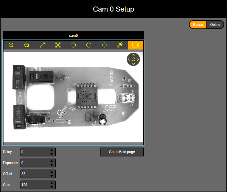 Cam<X>Setup: A device configuration page used to test image acquisition and modify various acquisition properties (Delay, Exposure, Offset and Gain) on the fly when the job is Paused with the Pause-Online switch. The name of this web page corresponds to the name of the vision system used in the job.